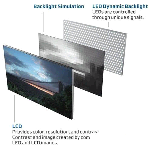 LED晶粒,直下式的好处是能够分别设置不同的背光源模块权责区域,理论上也可以做到每一颗LED独立发光控制亮度,但线路与设计成本不易,实际上都是在屏幕的背光源设定多个区域,让这些区域能够独立调整明暗度。