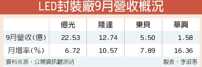 不仅基本面有利于产业筑底,LED厂9月营收也多半回升,特别是LED 封装厂,亿光(2393)、隆达、东贝9月营收分别弹升6.72%、10.57%、7.89%,LED照明与背光订单均见回升,而芯片厂晶电9月营收亦回 升至21.46亿元,较8月成长11.84%。(工商时报)