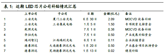 政府补贴收窄,意味着LED芯片端及封装端的无序产能必然受到抑制,同时如果未来进一步补贴LED照明应用端,则从根本上改善LED整体产业供需格局,LED产业链有望整体受益而进一步转暖。