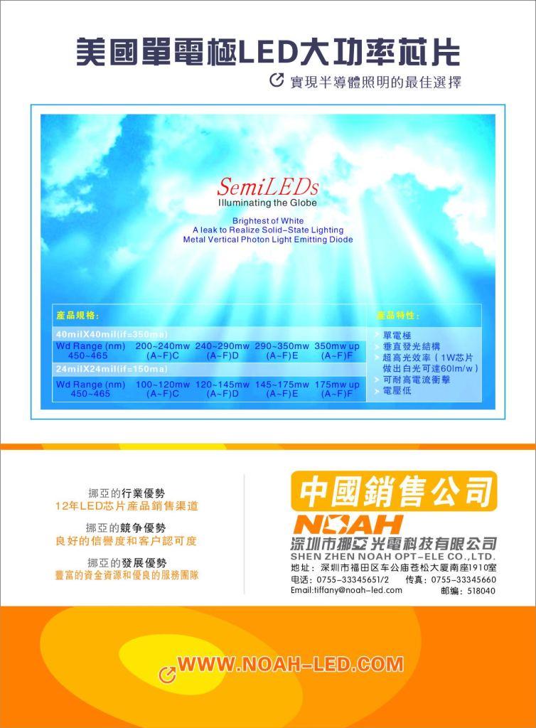垂直发光结构、光效高(1W芯片作出白光可达60LM/W)、电压低、单电极、可耐高电流冲击